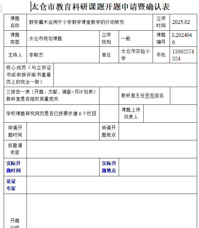 (太仓市)教育科研课题开题申请暨确认表
